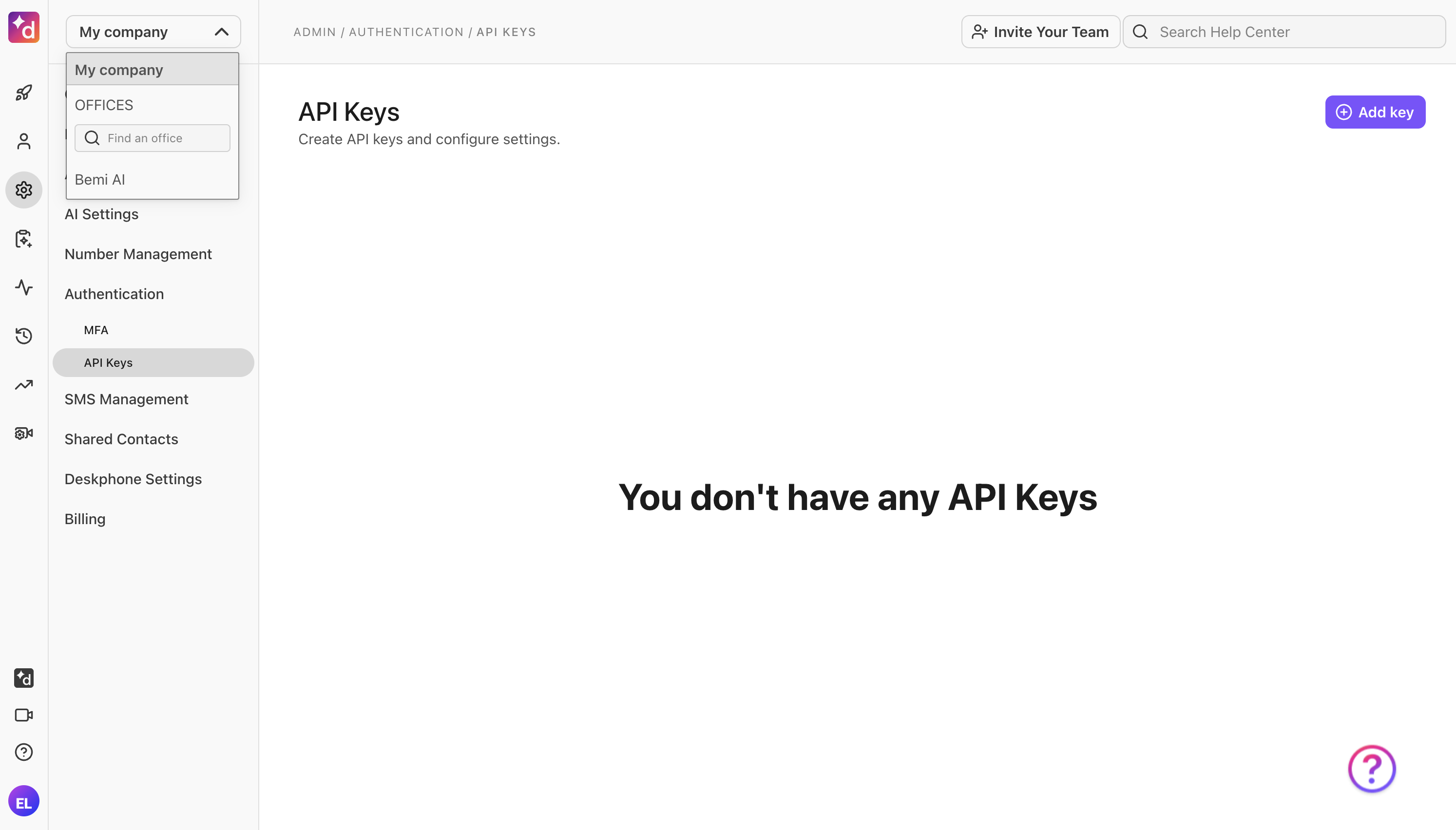 - Navigate to Admin Settings → My company → Authentication → API Keys.
