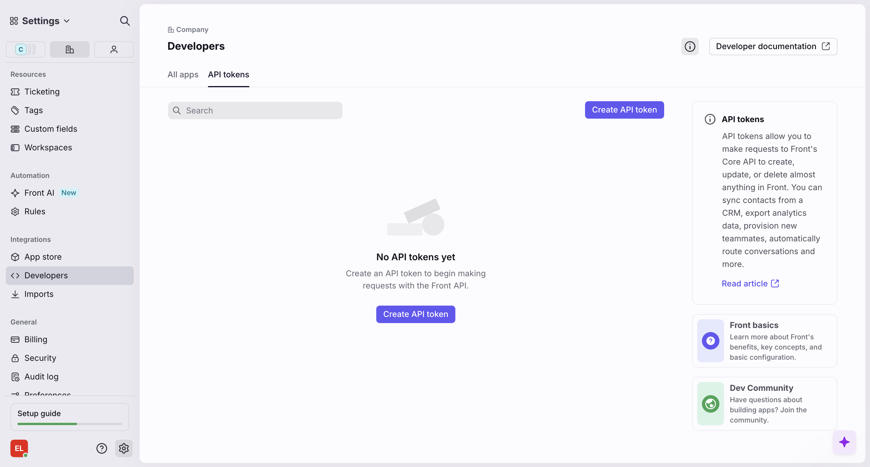 - Navigate to Company Settings → Developers → API tokens.