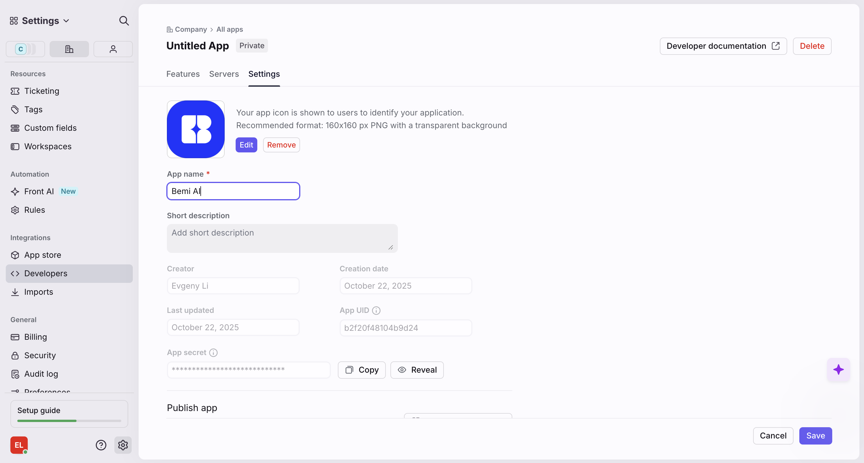 - Go to the app Settings, rename the app to Telio and upload the Telio logo: